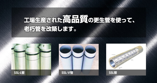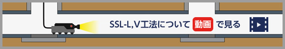 SSL-L,V工法は、老朽化した管きょ内に長さ600㎜、有効長500㎜の硬質塩化ビニル管(V管)または、ステンレス管(L管)を人孔内より接続挿入し、その後に既設管と更生管の空隙にセメント系充填剤にて裏込めする鞘管工法です。